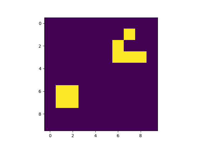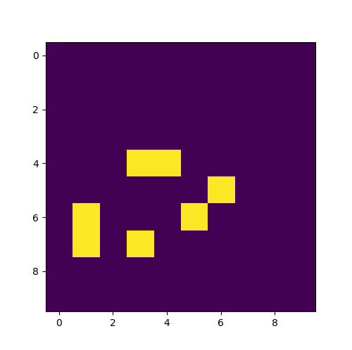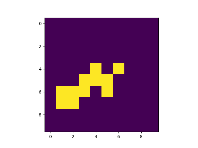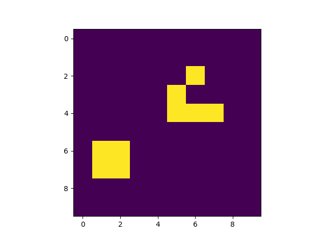 右図は,グライダーをセルオートマトンにより動かしたものです.初期状態から状態遷移を繰り返すと,グライダーは左下に進みす.左下にあるブロックとぶつかり粉々になり,最後は両者とも消滅します.簡単なプログラムですが,時間の変化とともにまるで生き物のような動きをします.