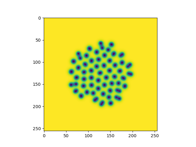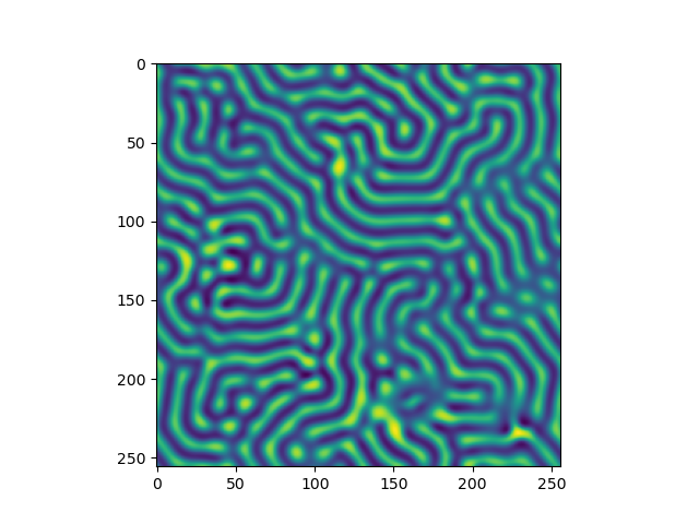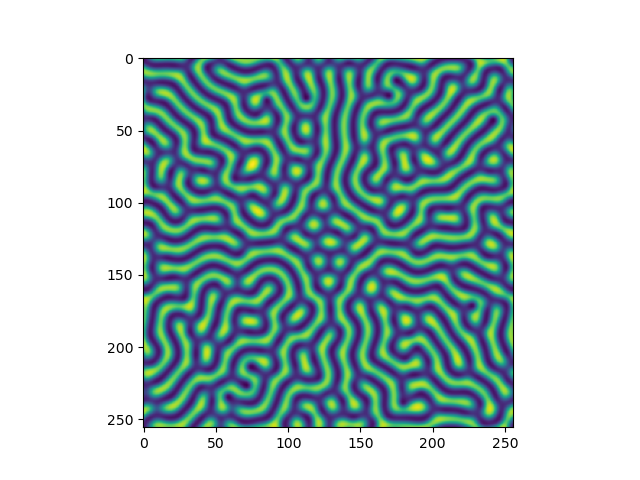 右縦図(グレイ・スコットモデルより)の一番上は,拡散方程式のみの状態変化を表しますが,下図3つ(順にstripe,spot,amorphous)は同じ数式(拡散方程式に反応項を加算した式)であっても,時間が経過すると,拡散と反応の濃度変化の違いから異なった形に組織化されます.確かに生物の模様に似ていますね,やはりチューリングは天才ですね(・_・;)).pythonプログラムを一部抜粋しておきます.