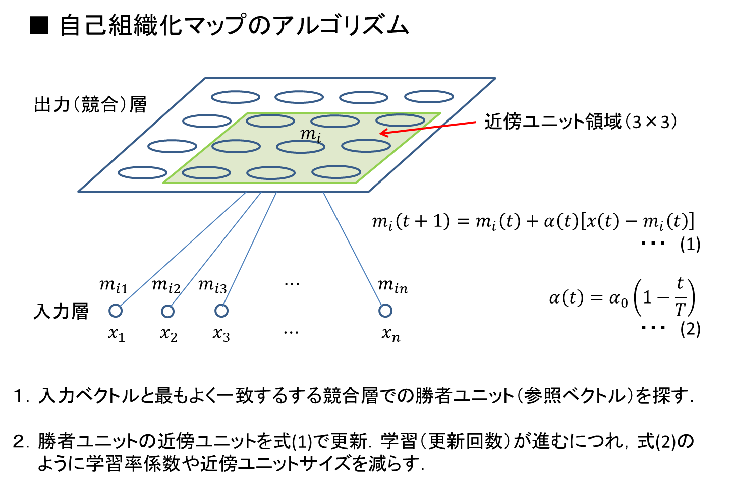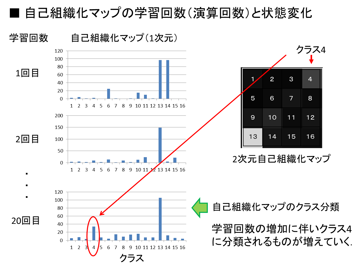 自己組織化システムの数学的な基礎についてはここでは省略しますが,線形・非線形系の状態変化であるダイナミクスを捉えることが大事です.上図は,あるデータに関してKohonenによる自己組織化マップを適用したものです.この自己組織化マップは,入力パターンとネットワーク内に蓄積されたベクトルとの比較を繰り返すことで,自己組織化(自発的に組織化)されます(上左図).具体的には,入力データがユニットのもつベクトルに適合したとき,そのユニットの近傍領域がクラスの学習データの平均を表現するように最適化(重みの修正を学習)されます.結局,無秩序であったユニットの組みが,局所表現として特徴マップに収束し,自己組織化されることになります(上右図).通常,高次元のデータをもう少し大きなマップに写像するため,各クラスは領域として選択されますが,ここでは頻度を利用しています.